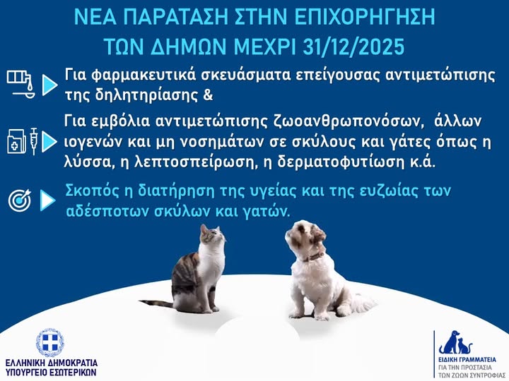 📍Με απόφαση του Υπουργείου Εσωτερικών, οι Δήμοι της χώρας (καθώς και οι διαδημοτικοί τους σύνδεσμοι) μπορούν εκ νέου να χρηματοδοτηθούν για την προμήθεια εμβολίων και φαρμακευτικών ουσιών για τα ζώα συντροφιάς.